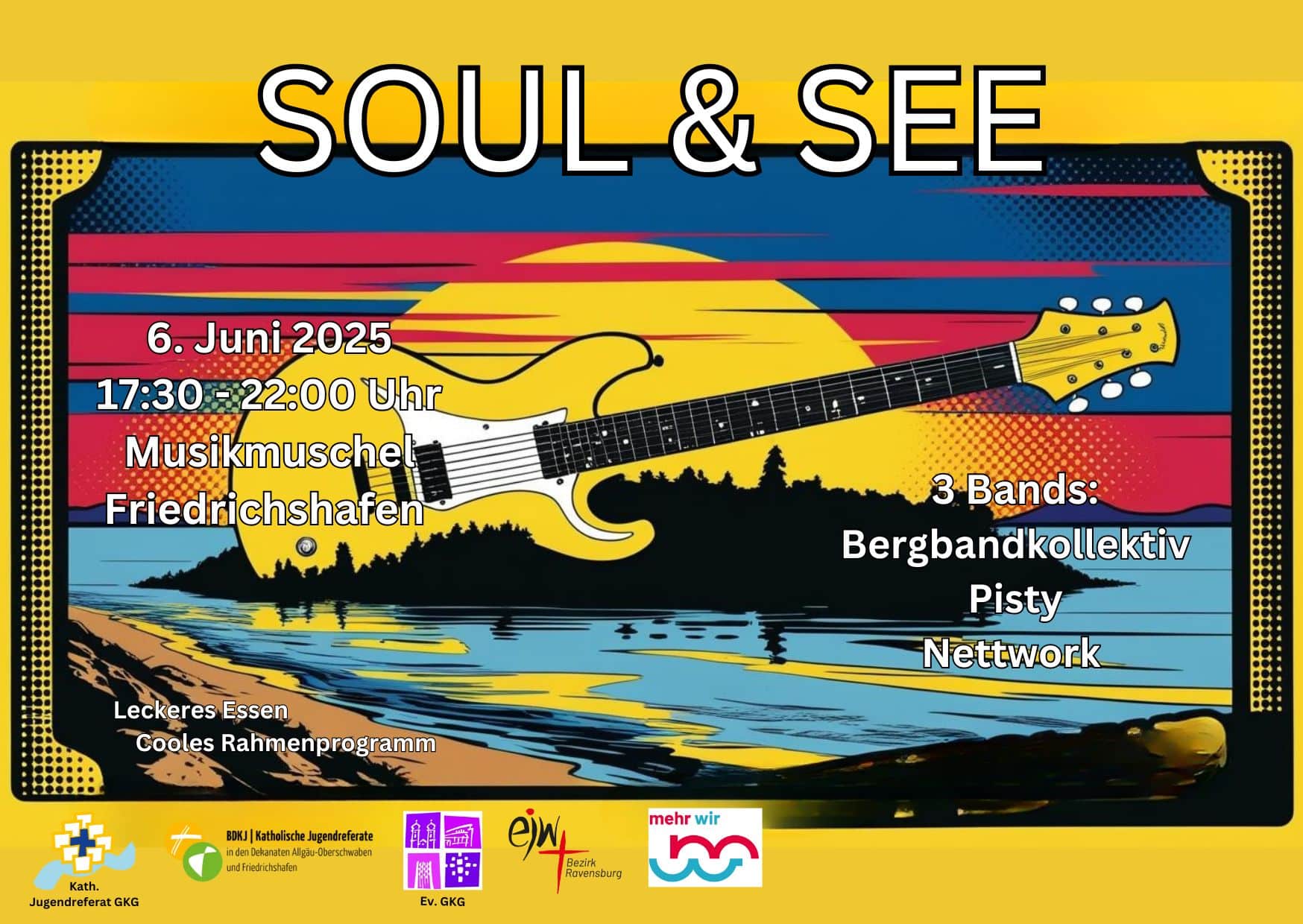 In ökumenischer Kooperation zwischen der evangelischen und katholischen Jugendarbeit in Friedrichshafen, ist das Format „SOUL & SEE“ entstanden. Drei Bands, die mit ihrer je eigenen Musik ihrem Glauben Ausdruck verleihen und die Zuhörer:innen damit in ihren Bann ziehen.